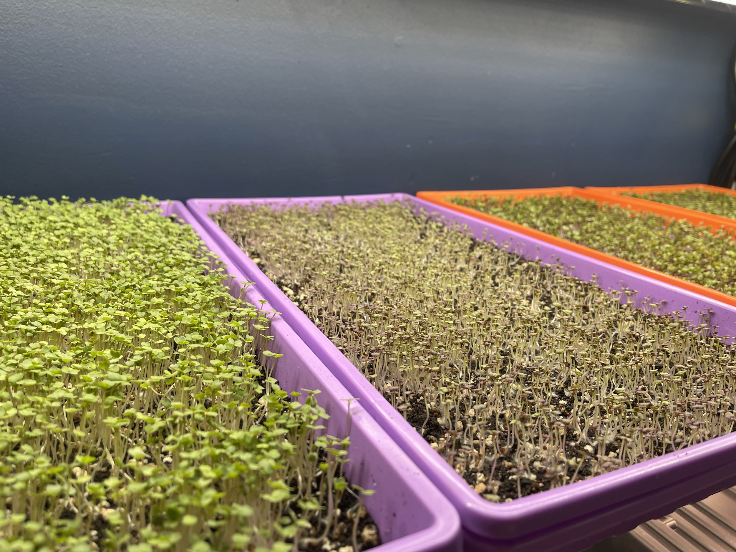We use LED lights and a small amount of soil to grow a dense amount of each variety. All we give the plant from there is water and love. The plants quickly sprout and fill out a tray!
